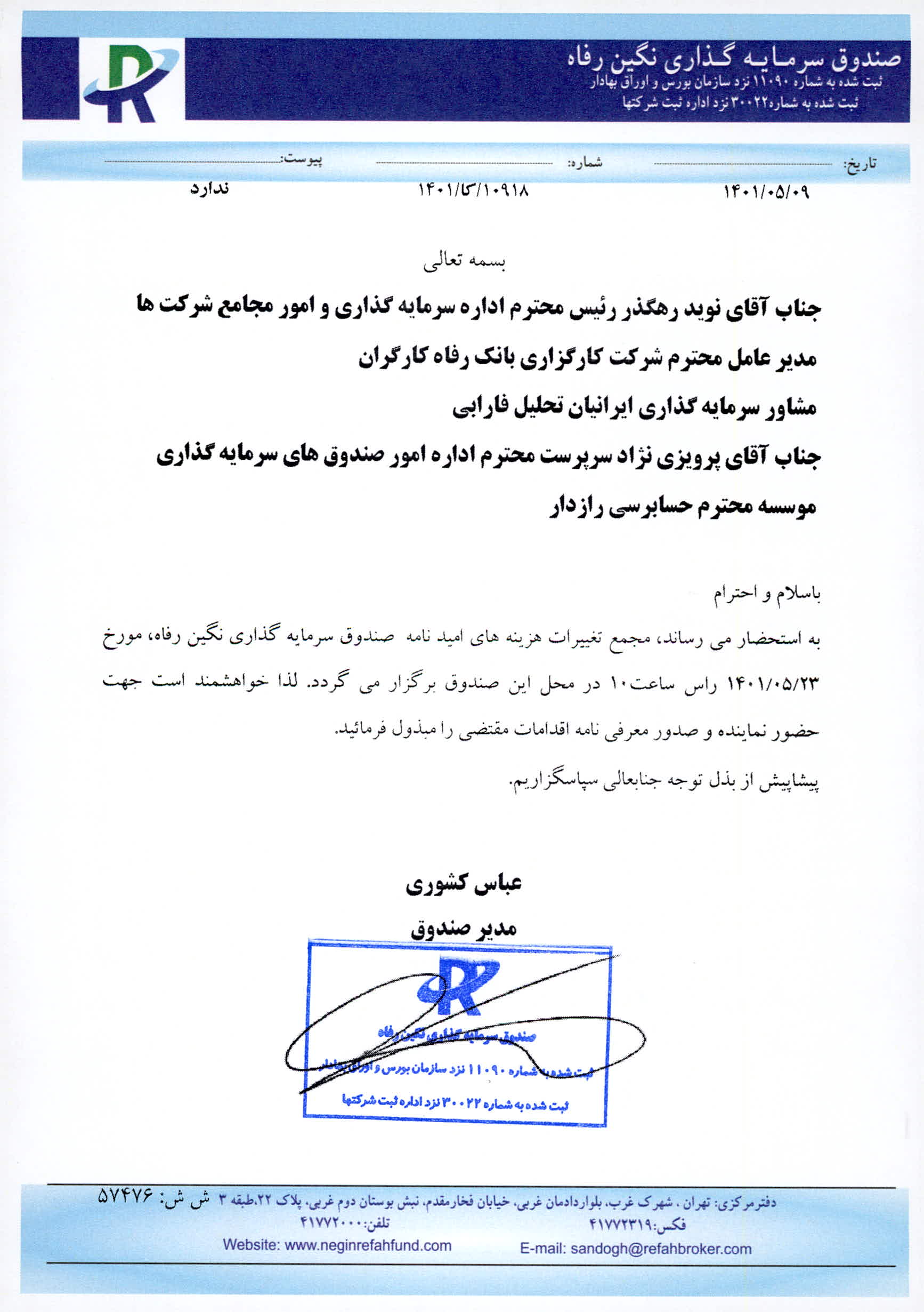| مقدمه | آگهی دعوت به مجمع تغییرات هزینه های امید نامه ای مورخ 1401/05/23 |